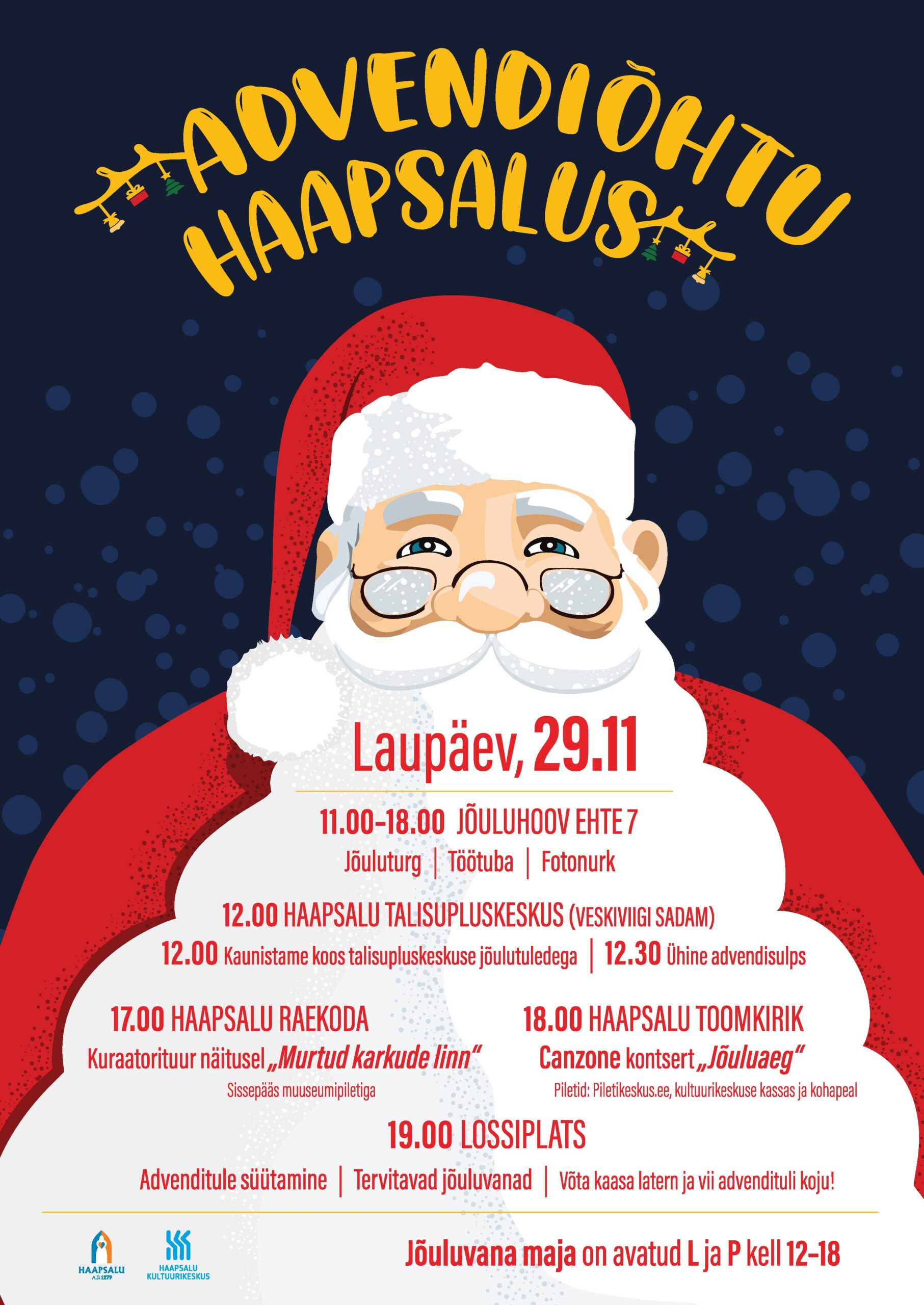 Hommikust alates ootab jõuluhoov oma turu, töötubade ja fotonurgaga. Talisuplejad panevad särama esimese jõulutuled ja kutsuvad ühisele sulpsule. Õhtupoolikul saab nautida kultuuri ja muusikat ning päeva lõpetame ühise advenditule süütamisega lossiplatsil.